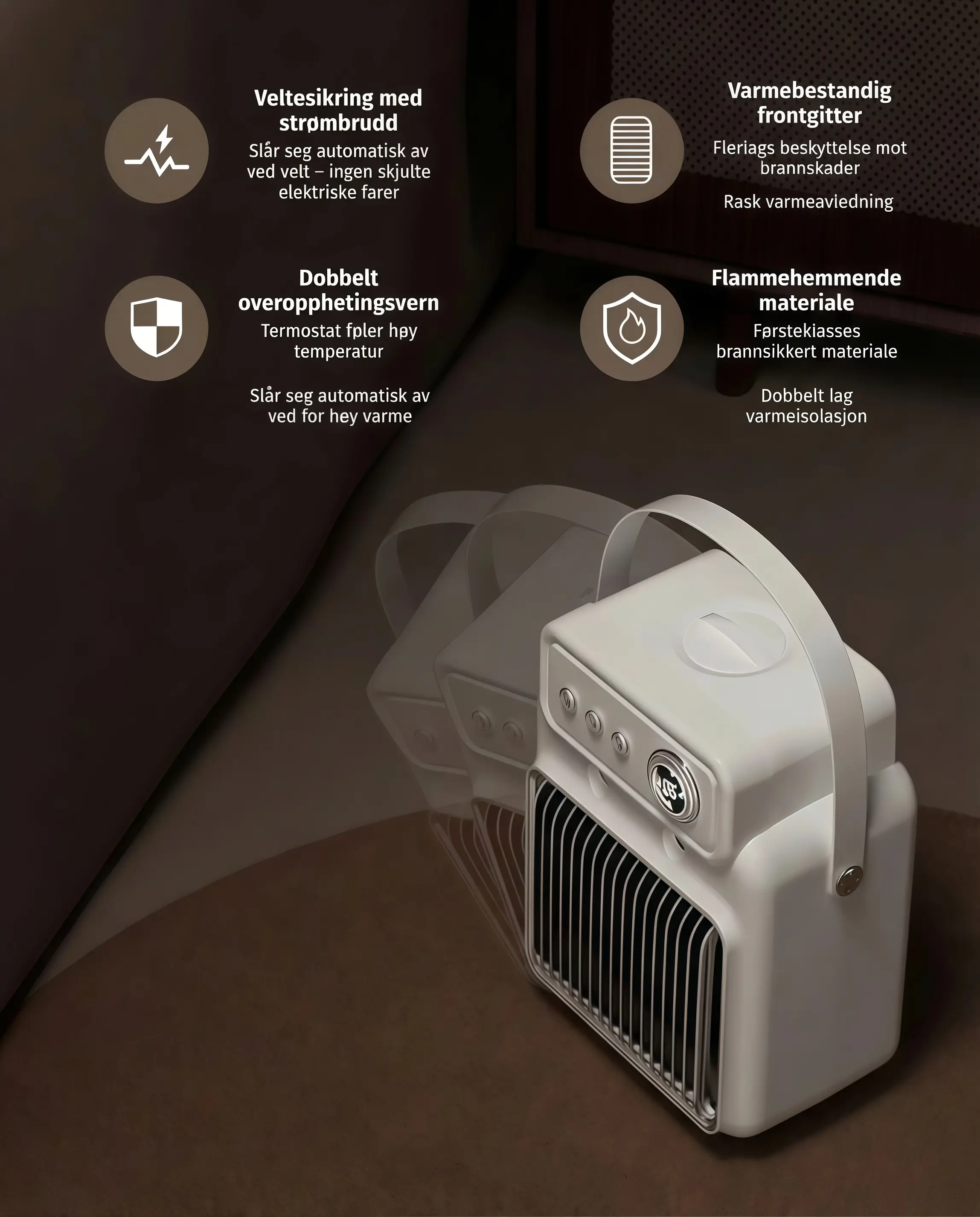 - Automatisk avstengning ved velt for ekstra sikkerhet